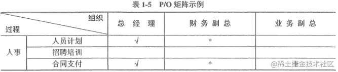 (4)为把企业组织结构与企业过程联系起来,说明每个过程与组织的联系,指出过程决策人,可以采用建立过程/组织(Process/Organization,P/O)矩阵的方法。“V”代表负责和决策,“*”代表过程主要涉及,“+”代表过程有涉及,空白表示过程不涉及。