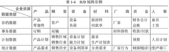 (5)为定义数据类,在调查研究和访谈的基础上,可以采用实体法归纳出数据类。资源/数据(Resource/Data,R/D)矩阵。