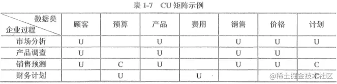 (7)CU矩阵。以数据类为列,按照企业过程生成数据类关系填写C(Create),使用数据类关系填写U(User),形成CU矩阵。