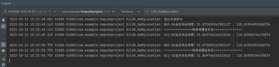 Log.d("LOG_HwMyLocation", "Gcj-02坐标系经纬度:" + Gcj02LatLng[0] + " ; " + Gcj02LatLng[1] + "\n");