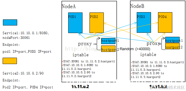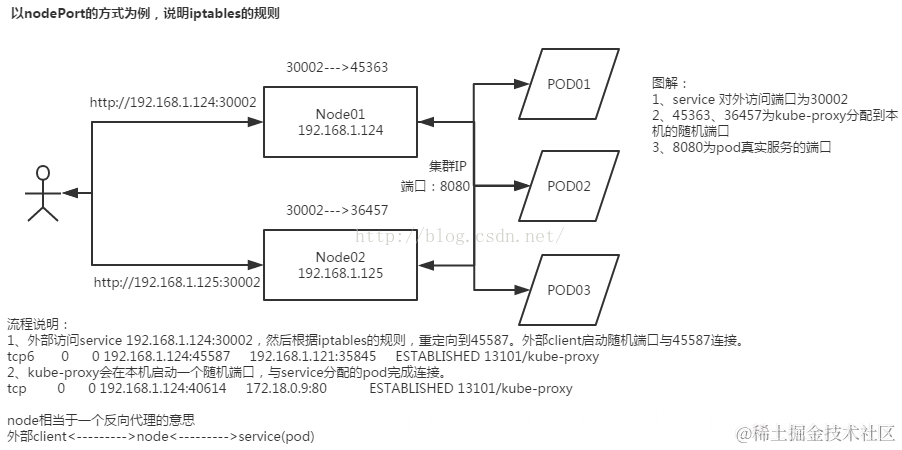 不管是通过集群内部服务入口<cluster ip>:port还是通过集群外部服务入口<node ip>:nodePort的请求都将重定向到本地kube-proxy端口(随机端口)的映射,然后将到这个kube-proxy端口的访问给代理到远端真实的 pod 地址上去。