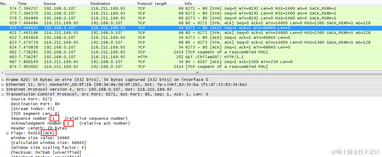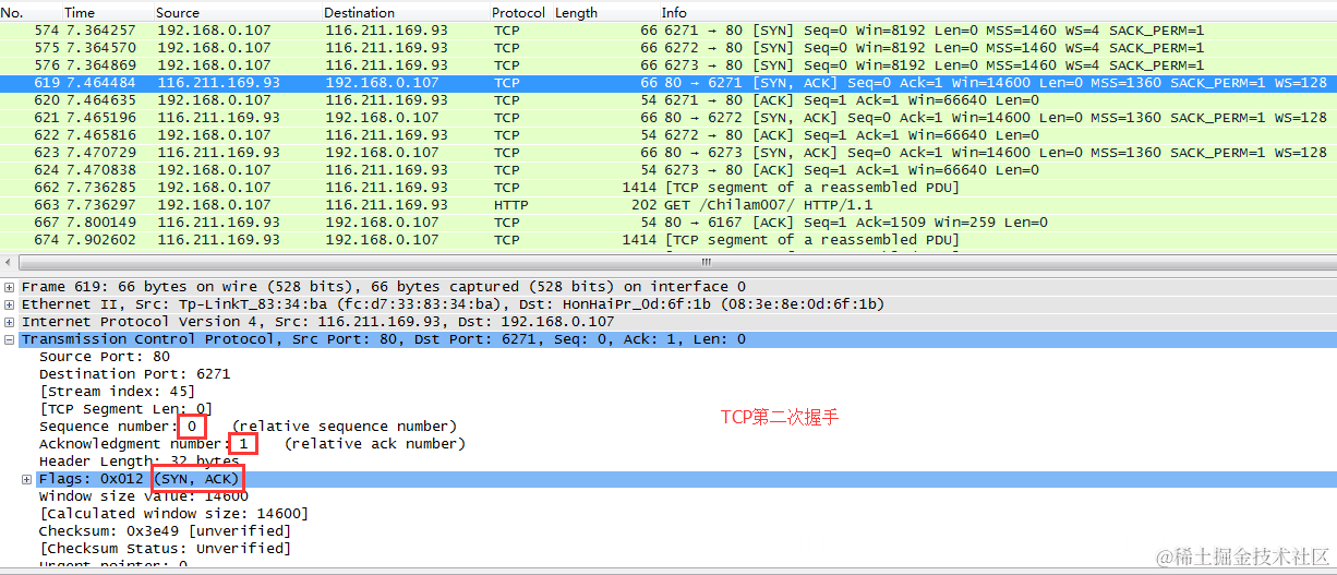 - 619帧是服务器得到请求后向客户端回应确认包的过程。标识为SYN,ACK。