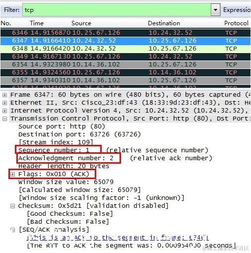 2)ACK:确认序号标志,为1时表示确认号有效,为0表示报文中不含确认信息,忽略确认号字段。