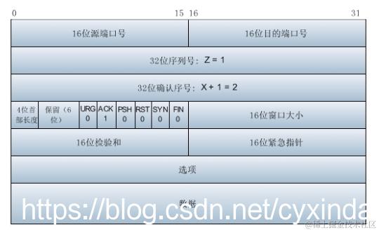 (2)第二次挥手:服务器收到FIN后,发送一个ACK给客户端(标志位ACK=1),确认序号为收到的序号加1(与SYN相同,一个FIN占用一个序号),即X=X+1=2。序号为收到的确认序号=Z。Server进入CLOSE_WAIT状态。