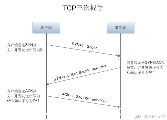 - 第一次握手:建立连接时,客户端发送连接请求包到服务器,标志位SYN(同步序号)置为1,随机产生一个序号seq=X的值。并进入SYN SENT状态,等待服务器确认。