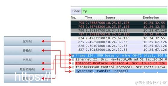 wireshark抓到的包与对应的协议层如下图所示: