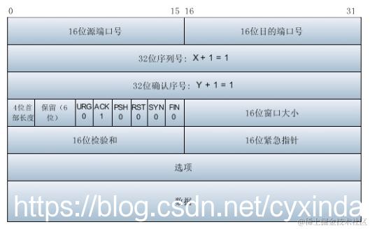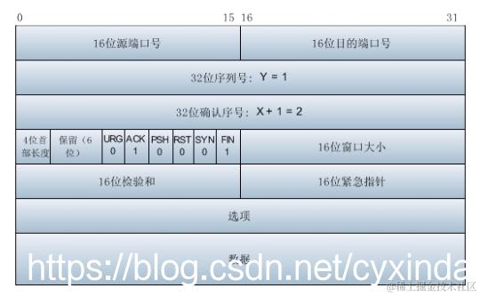 (3)第三次挥手: 服务器发送一个FIN,用来关闭Server到Client的数据传送,Server进入LAST_ACK状态。发送一个FIN中包含标志位FIN和ACK置为1,序号为Y=1,确认序号为X=2。