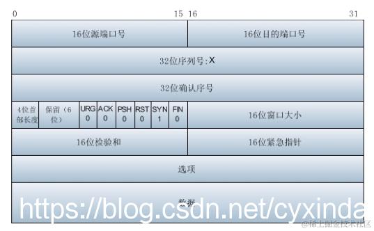 5)SYN:同步序号,用于建立连接过程,在连接请求中,SYN=1和ACK=0表示该数据段没有使用捎带的确认域,而连接应答捎带一个确认,即SYN=1和ACK=1。