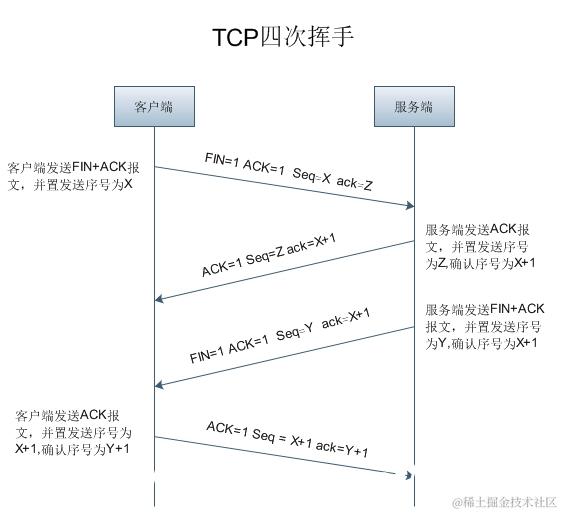 (1)第一次挥手:客户端给服务器发送TCP包,用来关闭客户端到服务器的数据传送。将标志位FIN和ACK置为1,序号为X=1,确认序号为Z=1。Client进入FIN_WAIT_1状态。