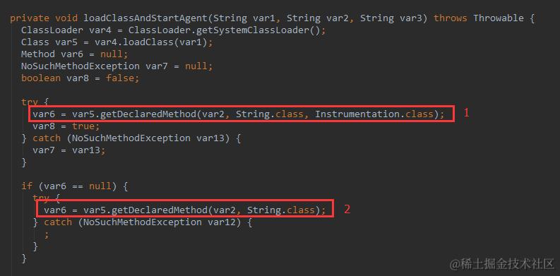 JVM 会优先加载 带 Instrumentation 签名的方法,加载成功忽略第二种,如果第一种没有,则加载第二种方法。这个逻辑在sun.instrument.InstrumentationImpl 类中: