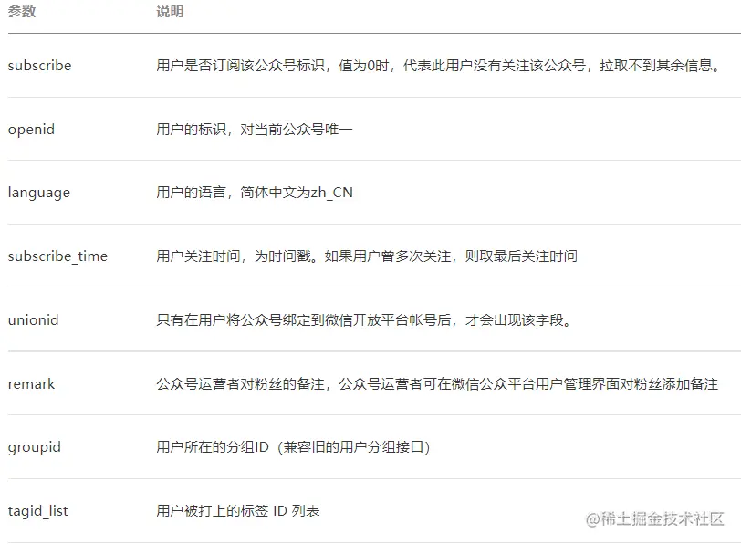 已知,平台的用户字段有手机号、公众号用户id。而关注公众号后能获取到的用户信息中主要有如下参数,而无法获取到用户的手机号。因此,要想实现绑定有两种方式: