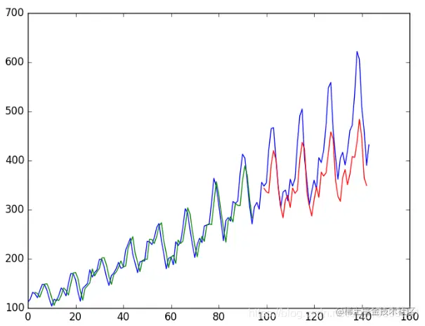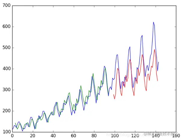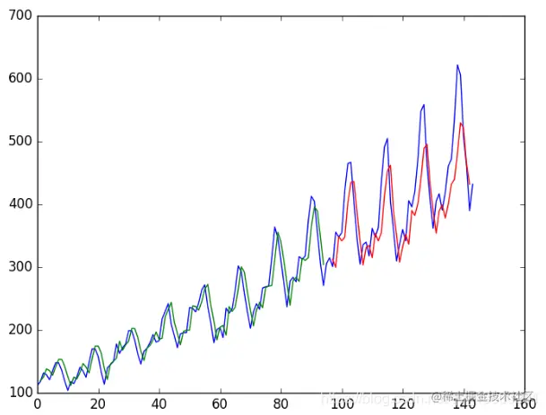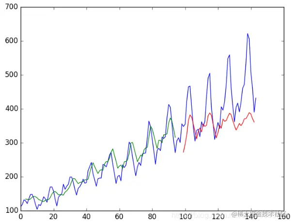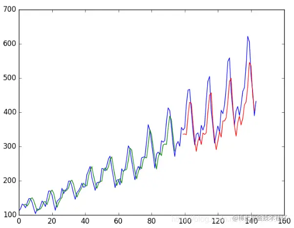 由于数据集的准备方式,我们必须移动预测,以使它们在x轴上与原始数据集对齐。准备好之后,将数据绘制成图表,以蓝色显示原始数据集,以绿色显示训练数据集的预测,以红色显示看不见的测试数据集的预测。