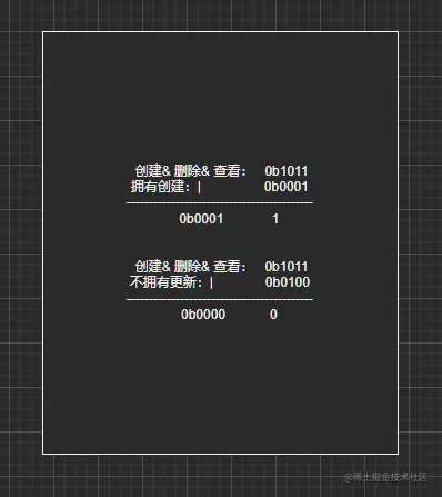但是不管是通过变量去定义或者是权限点去定义,都需要多个变量才能表达这个用户的权限, 如果我们为每种有可能出现的权限都写一个变量来标识, 那我们需要写 2 ^ 4 = 16 个变量还储存这些组合,如何通过一个变量去表达这个用户的权限尼?
