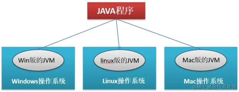 之前说到它的特点有个跨平台性,这就离不开Java的JVM虚拟机,同一个java程序,在JVM虚拟机编译之后可以在三个不同的操作系统中都可以运行,如下图: