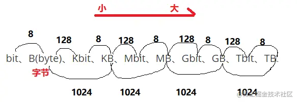 计算机换算单位(小到大):bit、B(byte)、Kbit、KB、Mbit、MB、Gbit、GB、Tbit、TB....,换算关系如下图: