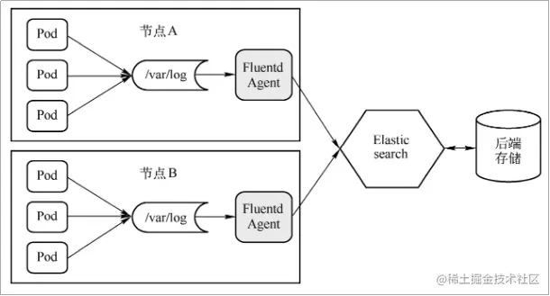 节点上的业务容器都会写日志到节点的/var/log 目录下,每个节点上的Fluentd容器加载该目录并读取其中的内容,然后推送到Elasticsearch,Elasticsearch将日志存储在后端。通过该种模式,kubectllogs命令依然可以查看每个Pod的日志。此外,一个节点一个Fluentd容器也提高了资源利用率。所以这是最佳实践的一种方式。