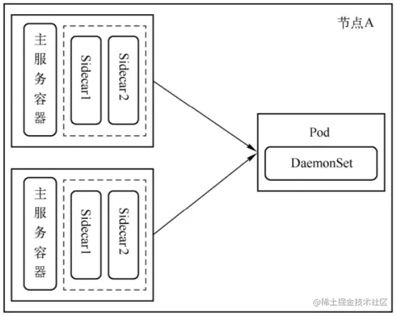 由于伴生容器是基于同一个镜像产生的,且功能具有重复性,因此可以考虑在一个node上只部署一个容器,然后通过代理或其他机制把本应伴生容器做的工作中继给这个容器。这样,一个节点上若有m个主服务容器,则只需要mx(k-1)+1个容器。资源节省了很多,而且管理方便。这就是DaemonSet模式,如图2所示。