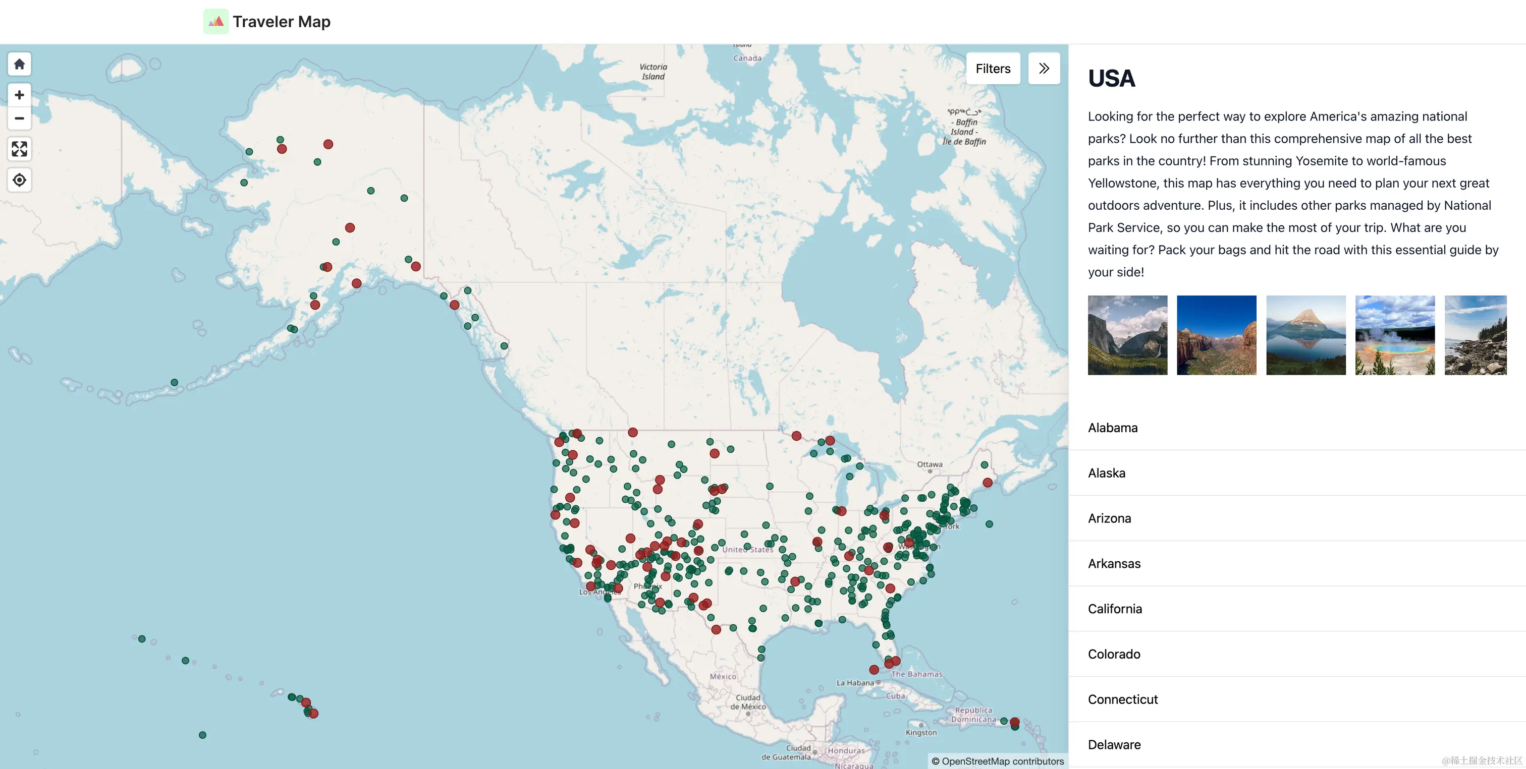 - World travel map - 这个网站可以看到美国的国家公园分布和世界各地的国家公园。做的很不错。