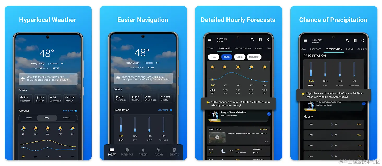 - 1Weather: Forecast & Radar - 这个天气应用可以说是 Google Play 上用的人最多的了,5000万+的下载。