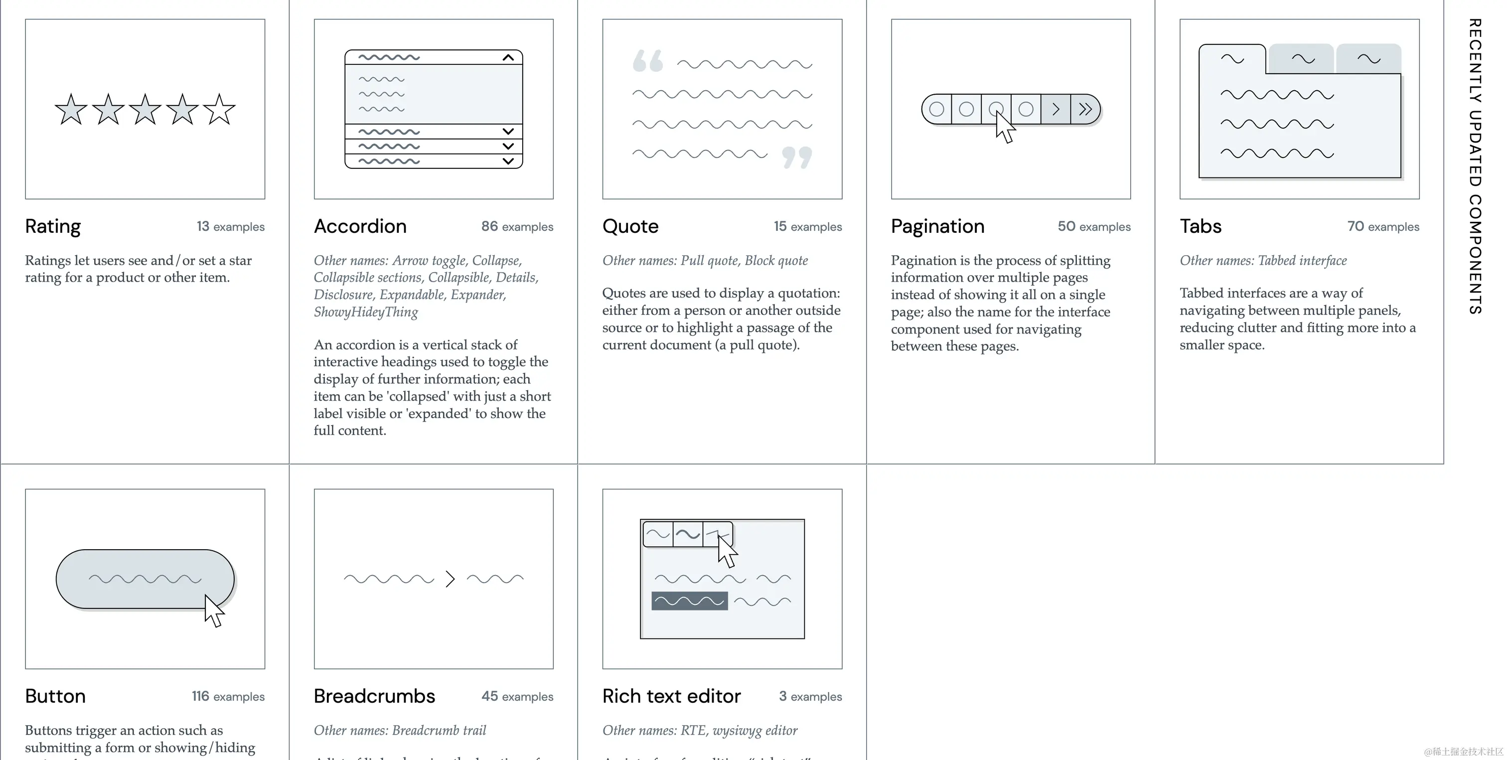 - the component gallery - 这个网站收集了很多组件库的在线案例,安利是挺多的,但是组建类型目前还比较少,估计作者还在逐步添加,网站做的不错。
