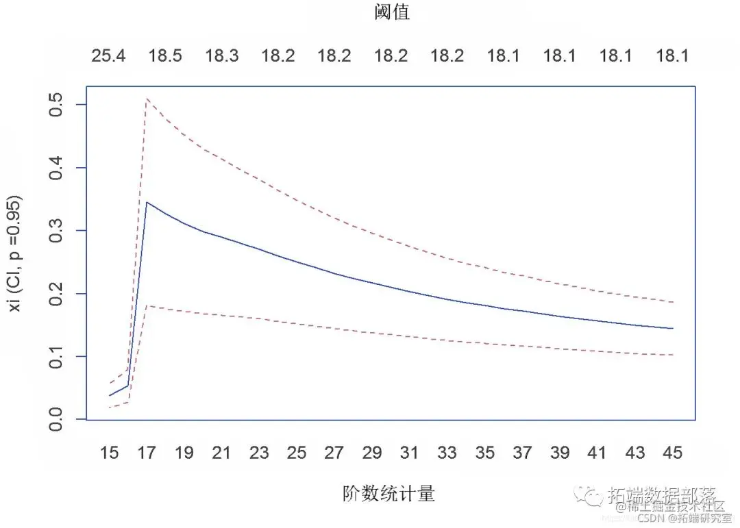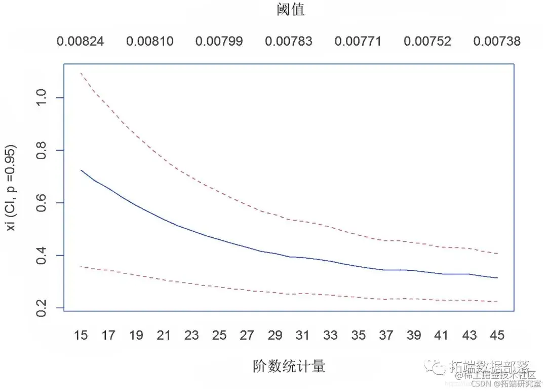 由于假设10股指数数据为重尾分布,数据极少变化,所以采用Hill Estimation对尾指数进行参数估计。目的是验证 10 只股票数据是否为极值分布。Hill Estimation 生成的图证实了。