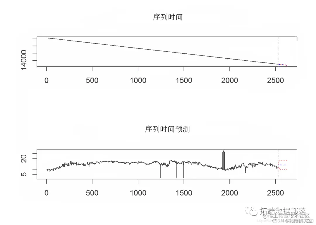 为了开始估算数据所隐含的未来事件,我们进行了初步的风险值估算。首先,所有行的平均值和日期信息的数据框架被转换为时间序列格式,然后从这个时间序列中计算出风险值。根据VaR计算对未来100天和500天的价值进行预测。在随后的预测图中,蓝色圆圈代表未来100天的数值,红色圆圈代表500天的回报值。