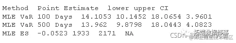 最后,给出了 10 个股票指数 MLE 未来价值的估计结果表。3 个 MLE VaR 估计值(和 MLE 期望损失ES)的点估计值和范围被制成表格来比较。