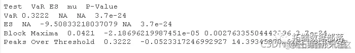 下表汇总了检验 极值分布的 10 个股票的四种方法的结果。第一列包含四种估计方法的名称。提供了 VaR、ES、mu统计量和 Anderson-Darling P 值的统计量。