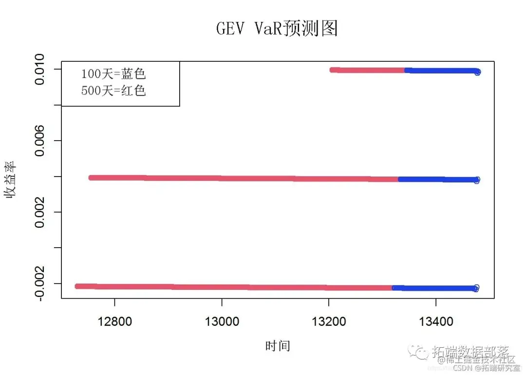 为了从 Block Maxima 数据中创建风险价值 (VaR) 估计,将 10 股指数 GEV 数据转换为时间序列。VaR 估计是根据 GEV 时间序列数据进行的。未来值的预测(未来 100 天和 500 天)是从 VaR 数据推断出来的。在结果图中,蓝色圆圈表示未来 100 天的值,红色圆圈表示 500 天的收益率值。
