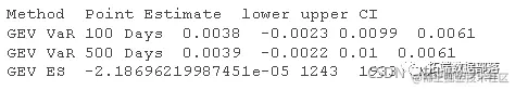 最后,给出了对 10 股指数 GEV 未来价值的估计结果表。3 个 GEV VaR 估计值(和 GEV 期望损失)的点估计值和范围制成表格比较。