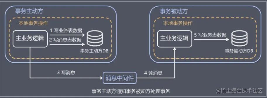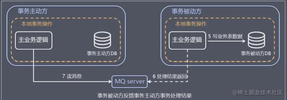- 事务主动方基于MQ通信通知事务被动方处理事务,事务被动方基于 MQ 返回处理结果。