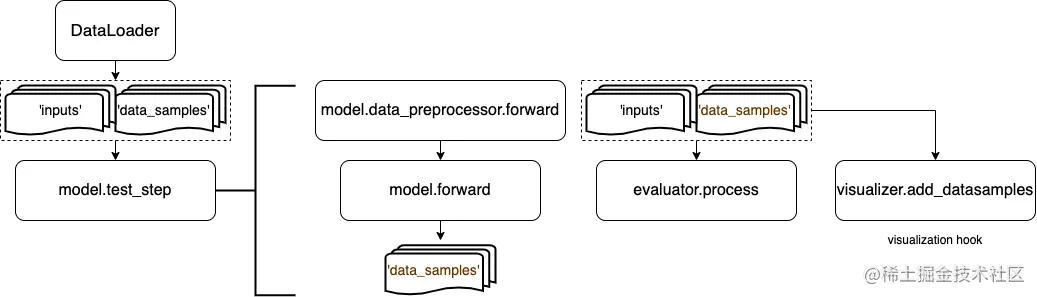 测试时,数据会传给模型的 test_step 方法,同样是先经过预处理,predict 输出 datasample。这里的datasample 就是输入网络的 datasample,只不过新增了 pred_sem_seg 和 seg_logits 两个字段用以保存网络的预测结果。将这个修改后的 data sample 和 inputs 送到评测器计算评测指标,或者送到可视化器中进行处理。