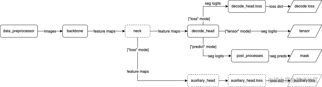 - auxiliary_head(可选),负责从输入的特征图预测分割结果,但结果只是在训练过程中参与损失计算,不参与推理,在推理时只从解码头中预测输出结果。