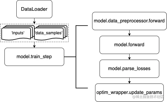 全新升级的 OpenMMLab 2.0 定义了数据流协议,分为训练和测试两种。训练的时候,dataloader 搬运经过 data transforms 处理的数据,传给模型 train_step 方法,模型里会先调数据预处理模块,再传给模型的 forward 函数,前传并计算损失。这个 loss dict 会经过 parse_losses 模块解析,得到一个 loss scalar,然后在 opitimizer warpper 里的 update_params 对模型反传,计算梯度,并更新参数。