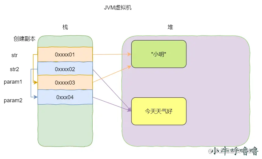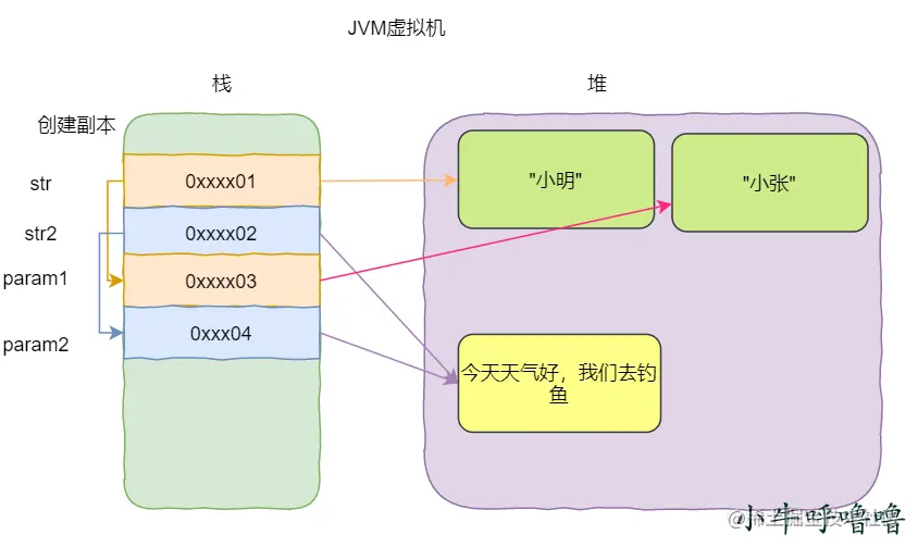 可能又有人问了,那str变量值为啥没有改变呢?其实这完全是由于String类的特殊,我们知道它是不可变的final,这个时候在函数中 param1= "小张";其实会隐式创建一个新的String对象,同时堆内存中会开辟一个新的内存空间,param1指向了这个新开辟的内存空间。原地址str指向的堆内存空间中数据没有任何改变。