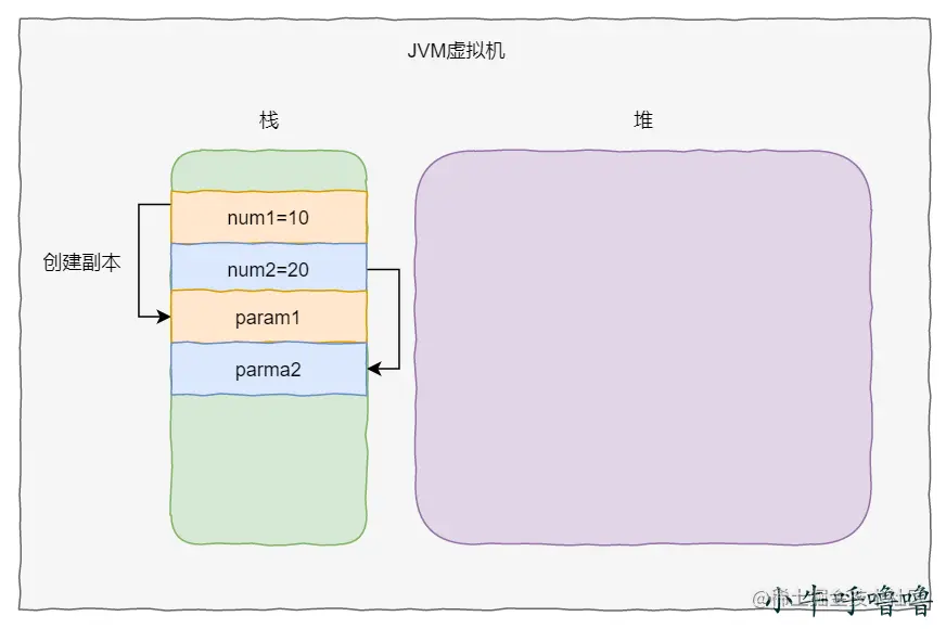 参数是基本数据类型,复制的是具体值;如果参数是引用类型,把地址当成值,复制的是地址;还有String类是一个非常特殊的类,她是不可变的。