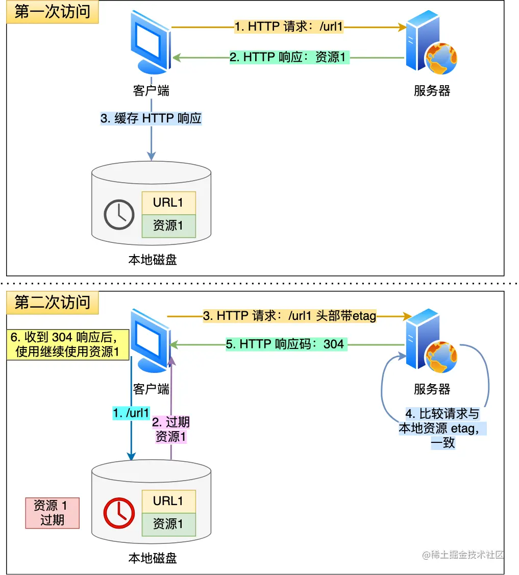 - 如果值相等,则返回 304 Not Modified,不会返回资源,浏览器直接从本地缓存拿即可;