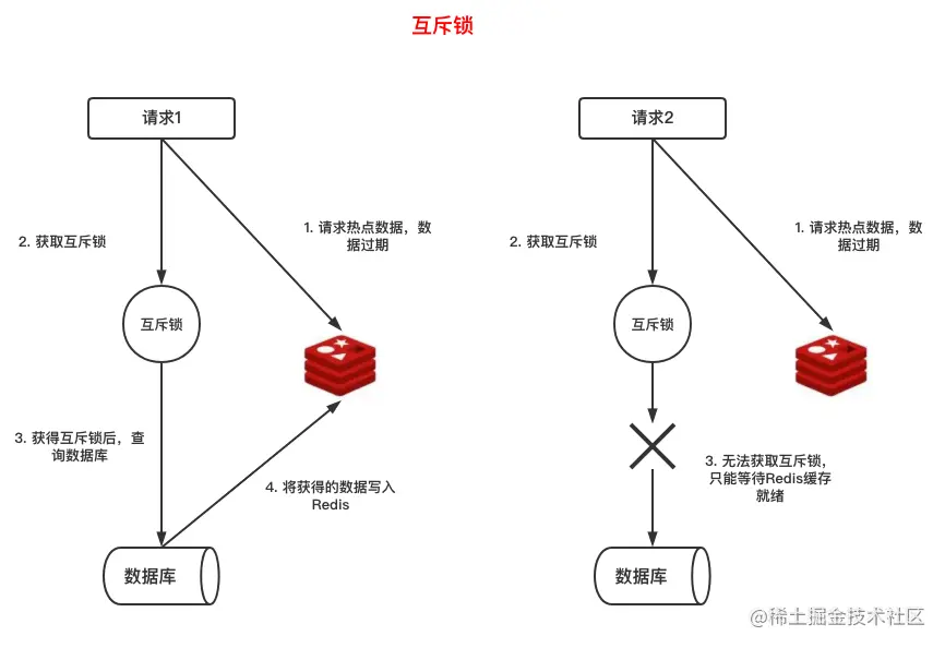 好了,我们知道热点数据过期后,很多请求会去查询数据库,那么我们可以给去查询数据库的业务逻辑加个互斥锁,只有获得锁的请求才能去查询数据库并把数据写回Redis,而其他没有获得锁的请求只能等待数据就绪。