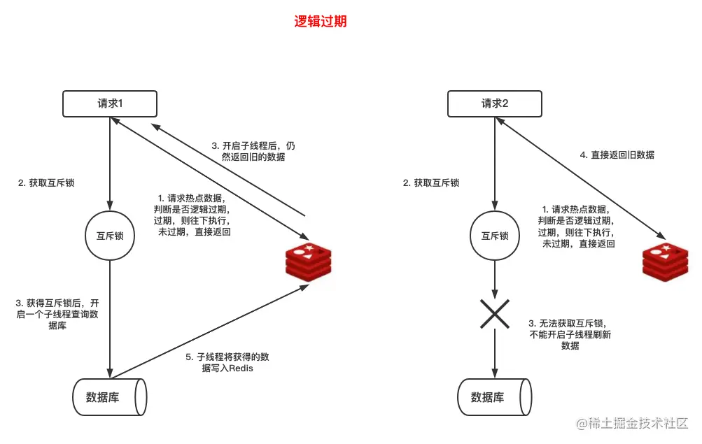 当一个请求拿到Redis中的数据时,判断逻辑过期时间是否到期,如果没有到期,直接返回,如果到期则开启另一个线程获得锁后去查询数据库并将查询的最新数据写回Redis,而当前请求返回已经查询的数据。