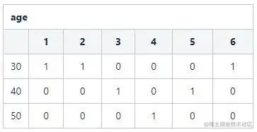 这是很典型的一张数据库表。对于表中的字段,如何构建位图索引呢?以age字段为例: