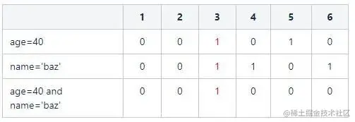 则取age字段位图中age=40的向量:110001和name='foo'的向量:100100。两个向量进行交集运算:
