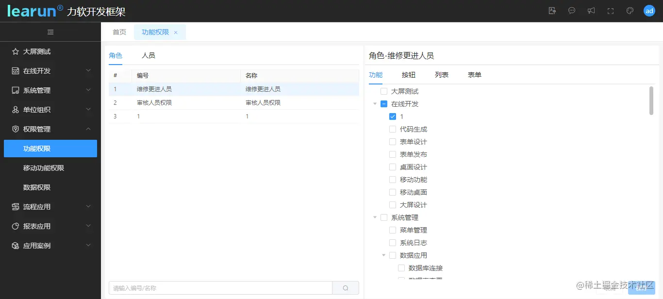 为了提升后期维护工作的效率,LeaRun低代码开发平台提供[权限设置]模块。系统管理员无需修改应用后重新发布,即可以可视化的方式,动态调整每个角色的功能权限和数据权限。并且LeaRun低代码开发平台移动端和PC端联动同步,在PC端配置的权限设计在移动端可同步生成,省去重复配置的繁琐过程。