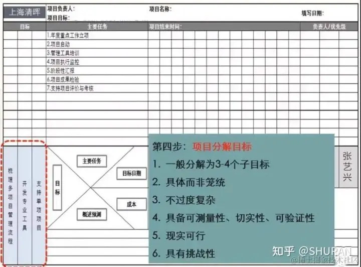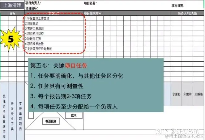 几个要素相互结合来填写内容,通过是否可以实现目标筛选出关键任务,任务确定后,在一页纸上面设置时间线,展示成本和负责人。