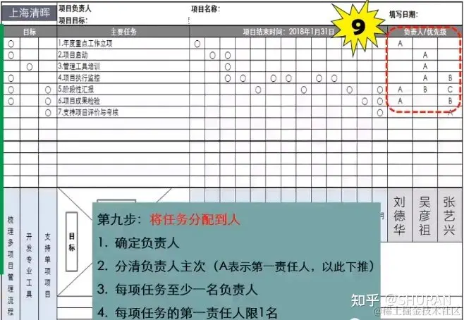 在这一步中,我们把任务分配给负责人,并且在一项任务有多个负责人的情况下,做出主次顺序的区分。通常会有一个主要的负责人,会被标记为A,次要负责人是B,第三负责人是C,切记每个任务必须有且只有一个主要负责人。