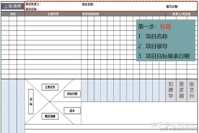 这一部分包含:项目名称、项目领导、项目目标、项目完成日期。
