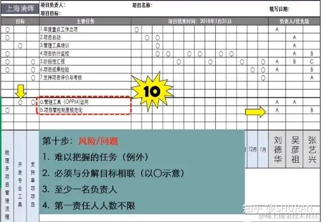 在项目中,例外情况往往贯穿始终,这一部分我们也需要尽可能管理和分配。虽然可能无法跟随整个项目的时间表,但同样需要任务关联且指定负责人对此负责。不过和上一步不同的是,这里第一责任人人数不限。
