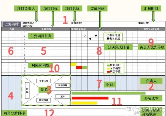在文件的中心位置,通过一个中央矩阵让项目中的各个关键信息都出现在表格中,并与四周信息(任务、时间、成本、目标、概述&预测)一一对应。