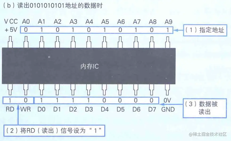 在读取数据时,只需要通过A0~A9的地址信号指定数据的存储场所,然后再将RD(read的缩写)信号设成1即可。执行完这些操作,指定地址中存储的数据就会被输出到D0~D7的数据信号引脚中。