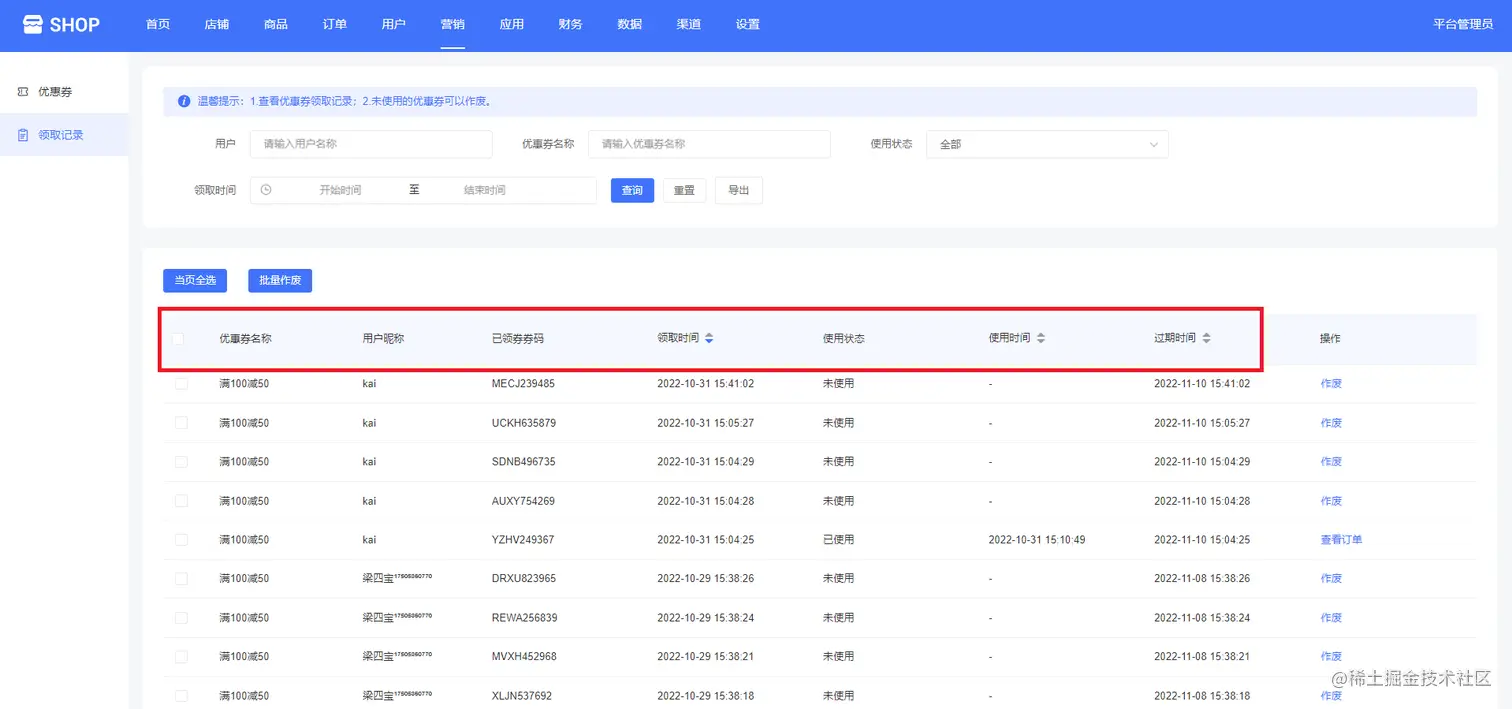 下面可以看到优惠券名称、用户昵称、已领券券码、领取时间、使用状态、使用时间、过期时间等,未使用的优惠券可以作废,如下图所示: