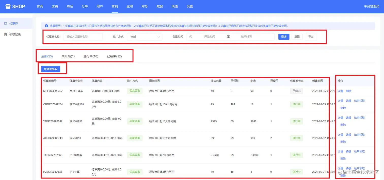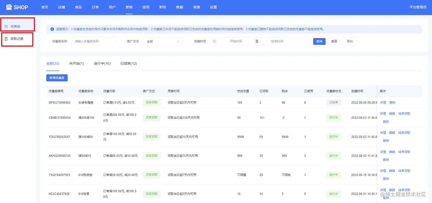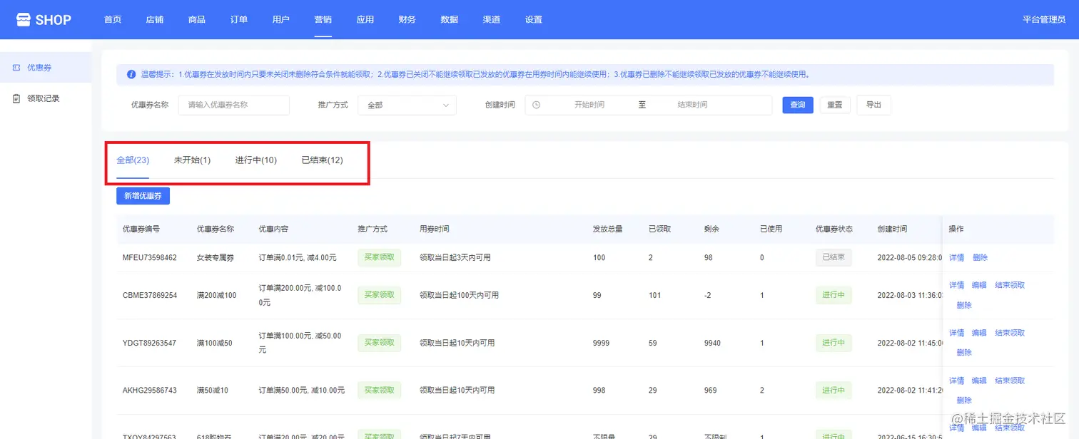 平台管理可以通过输入优惠券名称、选择推广方式(买家领取、卖家发放)、创建时间等查询优惠券,如下图所示: